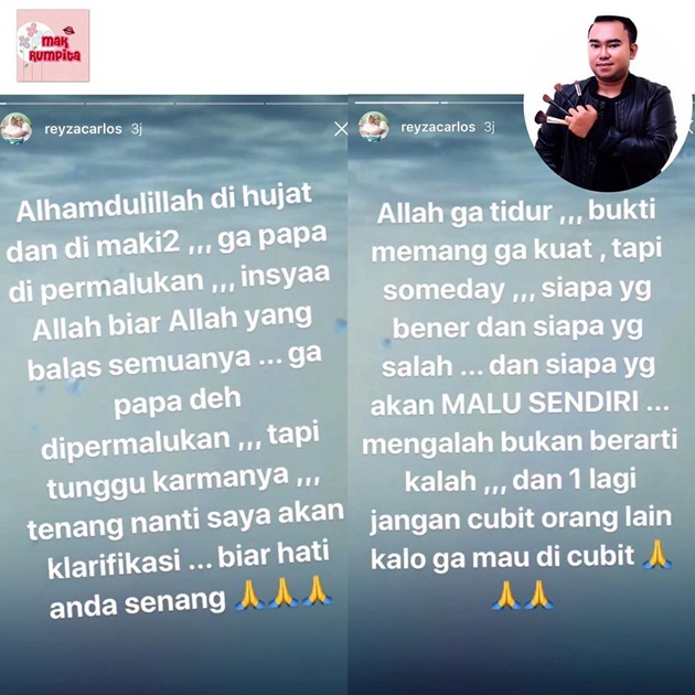 "Alhamdulillah di hujat dan di maki2,,,ga papa di permalukan,,,insyaa Allah biar Allah yang balas semuanya,,," tulis Reyza. "ga papa deh dipermalukan,,,tapi tunggu karmanya,,,tenang nant saya akan klarifikasi,,,biar hati anda senang."